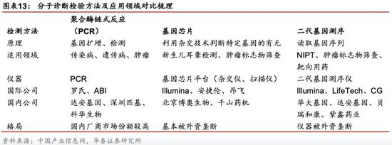 此外,核酸检测属于分子诊断的一种,我们认为未来分子诊断应用或进一步推广。分子诊断主要是指编码与疾病相关的各种结构蛋白、酶、抗原抗体、免疫活性分子基因的检测,是当代医学发展的重要前沿领域之一。分子诊断技术主要包括核酸检测类的聚合酶链式反应(PCR)、荧光原位杂交(FISH)、基因芯片和基因测序技术。目前,PCR技术发展较为成熟,应用也更为广泛。根据智研咨询的资料,2018年我国PCR的市场规模约占整个分子诊断市场的40%。以NGS技术为代表的基因测序技术目前已在无创产前诊断(NIPT)领域有了较大规模的应用,未来有望拓展应用到肿瘤检测等更多领域。