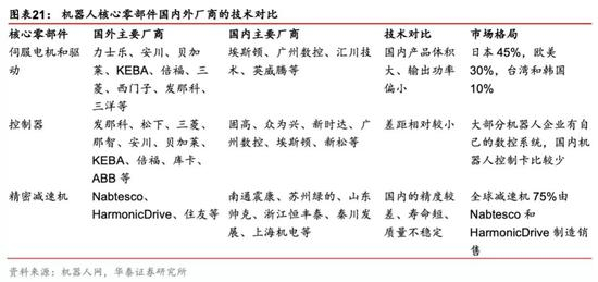 国内工业机器人自主可控过程持续推进,但仍与国际有较大差距。在核心零部件方面,中国在关键零部件的自主可控进程上逐渐推进,如减速器、伺服电机、控制器等。需求影响供给,近年来随着工业机器人下游需求火爆,本体生产制造商规模日益增大,核心零部件国产化趋势开始显现。在技术层面,目前中国已将突破机器人关键核心技术作为重要战略,国内厂商已攻克部分难题,正在稳步推进减速器、伺服电机等零部件的国产化核心零部件的技术突破有助于降低国产机器人的成本,提升国产机器人在新增装机中的占比。但总体来说,零部件国产品牌质量可靠性与稳定性仍有待提高,与国际行业巨头还有很大差距。