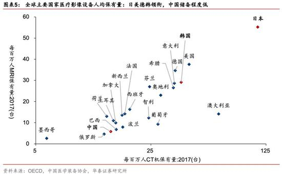 除口罩、防护服等日用医疗消费品外,CT等医疗影像设备的紧缺亦在本次疫情中尤为突出。根据OECD统计和中国医学装备协会数据,截至2017年底,中国每百万人CT机、MRI保有数量分别为14.3台、5.8台,在全球主要国家中排名靠后,绝大多数发达国家CT机保有量为15-50台/百万人,MRI保有量为10-40台/百万人,其中,日本、韩国等与中国有可比性的高人口密度国家的医疗影像设备储备更为充足,日本每百万人CT机/MRI保有量位居全球第一,且远高于排名第二的国家,分别达111.5/55.2台,韩国每百万人CT机/MRI保有量亦超过绝大多数发达国家,分别达38.2/29.1台。由于新冠疫情的诊断依赖于医疗影像设备与核酸检测的配合使用,国内医疗影像设备储备量与渗透率的短缺问题在短期被显著放大。