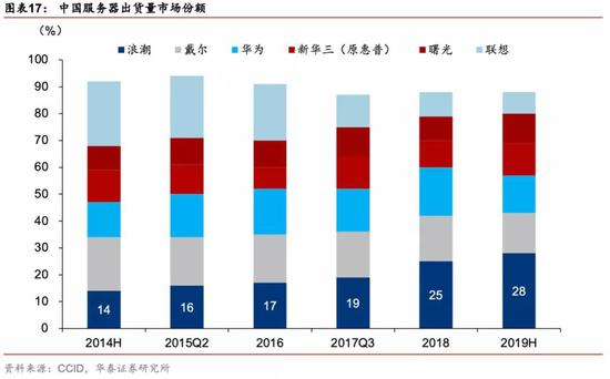 云上游需求增长以满足下游需求。我们认为,中国企业云化的进程与互联网巨头对云服务市场的布局,是对云基础设施需求的长期驱动因素,云基础设施(服务器等)需求将持续加速释放。服务器方面,2014年来浪潮服务器出货量占比不断上升,目前已经是国内市场服务器龙头,戴尔、华为、新华三、曙光与联想市场份额亦占比较高。