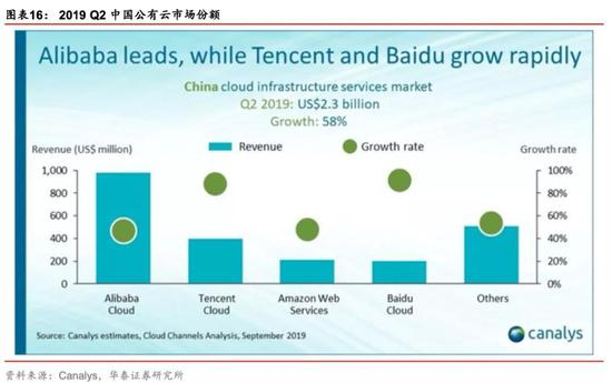 英国调研机构Canalys发布了2019年第二季度中国公有云服务市场报告。报告显示,在第二季度市场份额方面,阿里云排名第一。腾讯云、亚马逊AWS、百度智能云分列第2-4名。报告还显示,在第二季度,百度智能云增速高达92%,而同期行业第一的阿里云增长率仅为47%,百度智能云增速遥遥领先其他三家。在报告中,Canalys表示,百度智能云大举投资云计算业务,并专注于开发人工智能平台,其AI与云业务在中国电信行业、制造业和自动驾驶领域均有成熟落地项目。这些都为百度智能云提供了显著的增长机会。因此建议关注阿里、百度云服务产业链相关的企业标的。