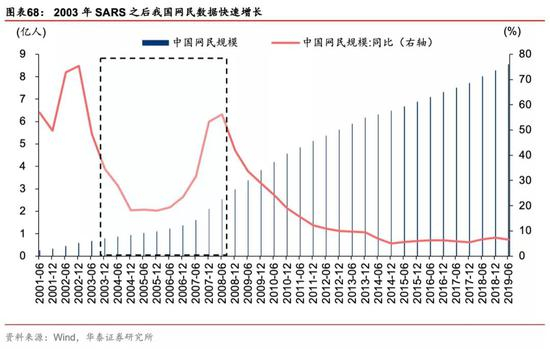 非典后电商行业的崛起不是偶然,而是大势所趋。一方面是线下零售企业由于本身在经营上受到冲击,因而部分企业开始主动谋求转型,行业格局发生改变。另一方面,我们认为居民上网习惯的养成是电商行业崛起的关键一环。在非典期间,由于长达数月的隔离,人们逐步养成了居家上网的习惯,而我国的网民规模也是自非典之后快速增长,2002年底我国网民数量仅为5900万,而到2003年底,我国网民数量更是达到8000万,在一年的时间里增长了2100万,而在此后我国网民数量呈现快速增长态势,截至2019年6月底,我国网民的规模已经达到8.54亿。