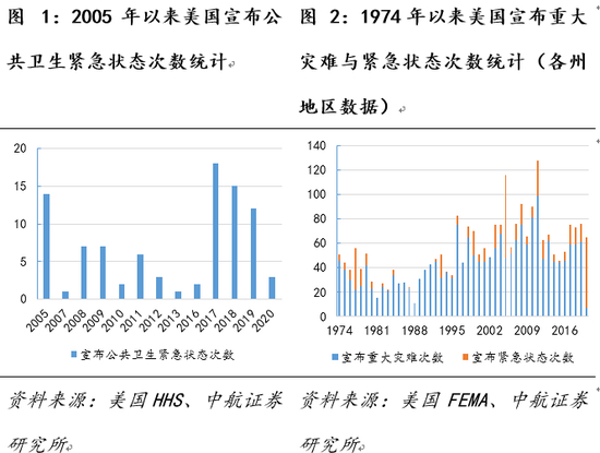 美国历史上宣布进入国家紧急状态多集中于制裁、贸易、国防领域。制裁相关的国家紧急状态占绝大多数,例如2019年5月特朗普总统宣布国家进入紧急状态,禁止美国公司使用“威胁国家安全”的企业所生产的电信设备。贸易相关的国家紧急状态主要是涉及军品的出口管制条例的更新。国防方面,布什总统在2001年9·11事件后宣布国家紧急状态,总统可以调动国民警卫队或退伍军人组织军队,并动用国防预算,打击恐怖组织。而公共卫生相关的国家紧急状态却仅有两次,分别是此次新冠肺炎疫情和2009年H1N1流感。