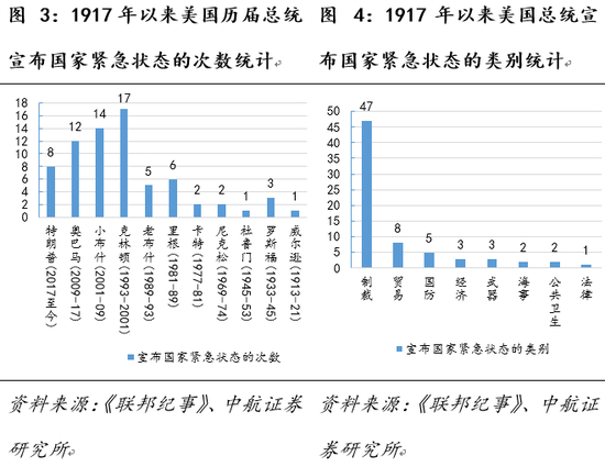特朗普任内曾因人权、选举干涉、地区局势、5G设备安全等制裁原因动用过6次国家紧急状态令。在国家紧急状态法律框架的基础上,美国《国际紧急经济权力法》是进行经济金融制裁的依据。根据《国际紧急经济权力法》,在国家安全和经济利益受到重大威胁时,美国政府可使用冻结、没收外国政府和个人持有的美国资产,其他制裁手段还包括贸易禁令、资本管制等等。