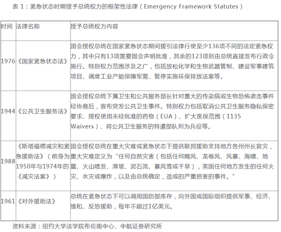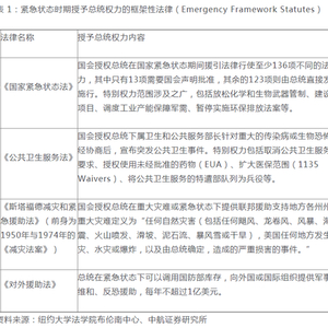 表1列出的重要的框架性法律,分别为不同类型的紧急情况(包括国家紧急状态、公共卫生紧急状态、重大灾难紧急状态)下授予总统权力提供了法律基础。
