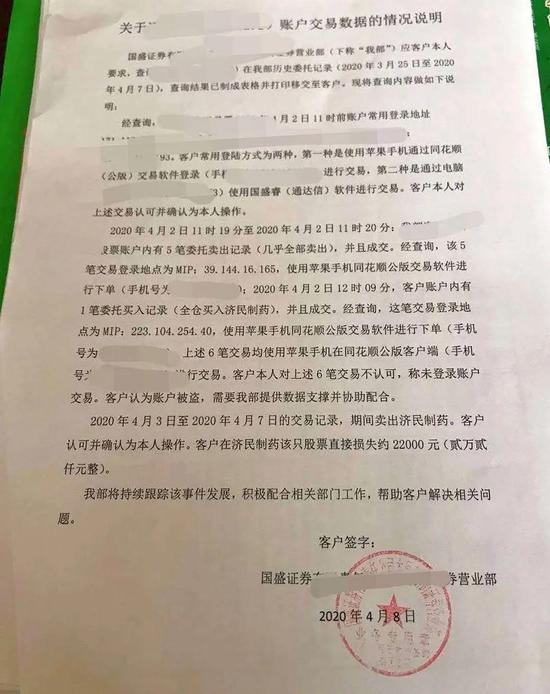 投资者冯先生(开户于山西)到4月3日才发现账户被盗。根据开户券商国盛证券提供给冯先生的情况说明,4月2日11时19分至11时20分,他的股票账户内有5笔委托卖出记录(几乎全仓卖出)并成交。经查询,该5笔交易登录地点为MIP:39.144.16.165。12时09分,有1笔委托买入记录(全仓买入济民制药)且成交。经查询,这笔交易登录地点为MIP:223.104.254.40。