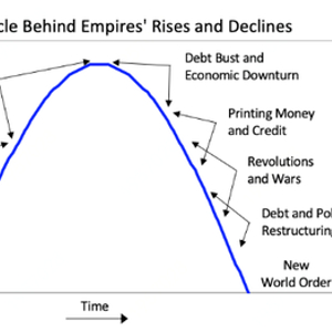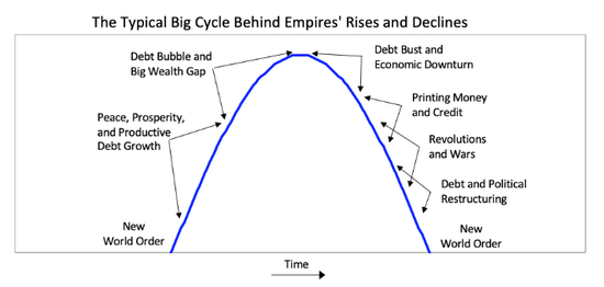 如图所示,在最开始新的世界秩序被创建之后,随之而来的是一个和平繁荣的时期。随着人们习惯了盛世,他们愈发认定繁荣将持续下去,继而更多地借钱享乐,这最终导致了泡沫。贫富差距随着经济繁荣扩大,最终,债务泡沫破裂。货币和信贷的印刷和内部冲突的增加,导致了或平和或暴力的财富再分配革命。通常到了周期末端,在上次经济和地缘政治战争中获胜的帝国常已不如在此次繁荣时期兴盛起来的敌对势力实力强大,在糟糕的经济条件和大国之间的分歧下,双方通常会有某种形式的战争。这些债务,经济与世界秩序的崩溃会促成一批新的赢家与输家。然后,赢家聚集在一起,创造新的国内与世界的秩序。