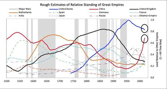 达里奥在21日发表的文章中讨论了包括中国与美国在内的,过去500年内帝国的兴衰。文章总结道:帝国就像人类一样,有一个典型的生命周期,最终走向落幕。而当下美国走向末章,中国正处上升期。