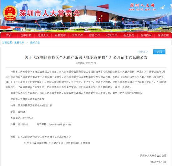 6月2日,21世纪经济报道记者获悉,深圳市人大常委会办公厅就《深圳经济特区个人破产条例(征求意见稿)》公开征求意见,这是我国首个就个人破产征求意见的地方法规。