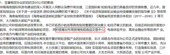 该公告还表示,海南瑞泽(002596)此次参与增资的标的公司(三亚国际邮轮发展有限公司)积极响应前述政策引导,并已开拓西沙航线等具有极其重要的政治意义和经济意义的航线,后续还将陆续开展南沙航线、中沙航线等其他南海邮轮项目,并积极筹划布局跨境免税商品交易中心、电商体验平台、离岸金融业务等延伸产业,合作各方均看好该产业的持续发展。