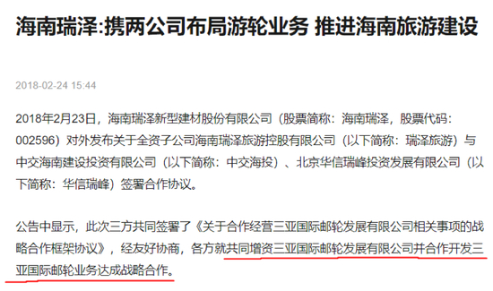 2018年2月23日,海南瑞泽(002596)对外发布关于全资子公司海南瑞泽旅游控股有限公司与中交海南建设投资有限公司、北京华信瑞峰投资发展有限公司签署合作协议。