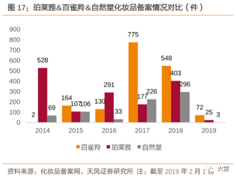 图46:珀莱雅、百雀羚、自然堂的化妆品备案情况