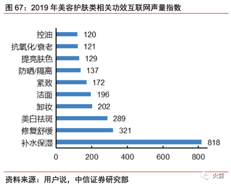 珀莱雅主打大众品牌,SKU以保湿为主(图31),很好的迎合了目前最主流的美容护肤需求(图32)。而上海家化和丸美切入的是中高端品牌赛道,这一领域虽然利润丰厚,但目前仍由海外大牌主导。国产品想要大幅提升销售额较为困难。