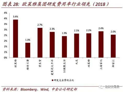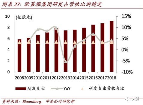 为了打造出超级单品,化妆品公司通常要维持一定水平的研发支出。欧莱雅能研发出一系列具有时代意义的超级单品(图37),与多年来保持的稳定(图38)、领先于行业(图39)的研发费用率密不可分。