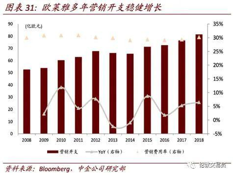 销售费用是化妆品公司最主要的期间费用,不仅反映了公司控制卖货成本的能力,更体现了公司的经营策略。比如,欧莱雅通过稳定的营销费用驱动营收增长,其营销费用率多年来维持在30%左右,绝对金额随着营收增加而稳健增长(图12)。