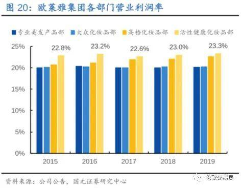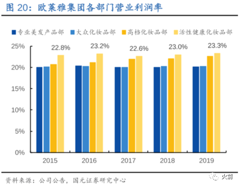 以欧莱雅的各部门为例,主打高端市场的两个部门毛利率要明显高于美发产品和大众化妆品部门(图8)。