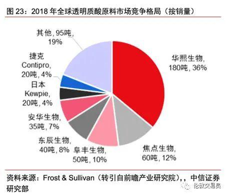 而在上游环节,由于全球原材料供应商众多、竞争激烈,毛利率通常低于30%。但值得注意的是,华熙生物(688363.SS)作为一家透明质酸供应商(比如说大家熟悉的‘玻尿酸’),受益于技术和牌照壁垒,其毛利率高达80%,在2018年的市占率稳居第一,是第二名焦点生物(未上市)的3倍(图4)。
