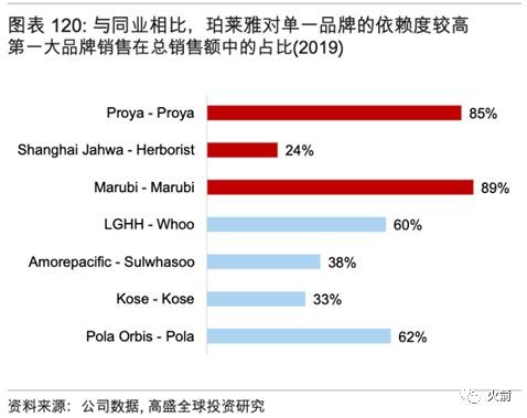 在国产化妆品公司中,上海家化的品牌多元化做的较好,而珀莱雅和丸美较为依赖单品牌(图43)。