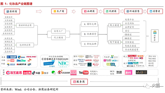 化妆品产业链涵盖了一系列玩家(图2)。上游是原材料供应商和生产商(华熙生物这类上游企业我们下期再聊),中游是化妆品品牌商(即本文重点讨论的对象),下游包括代理商、终端零售和消费者。