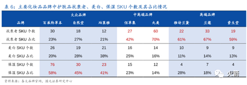 图31:主要化妆品品牌中护肤品抗衰老、美白、保湿SKU个数及其占比情况
