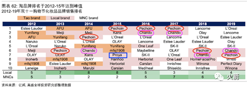 (4)珀莱雅线上销售额大幅落后百雀羚和自然堂。在过去8年中,珀莱雅(蓝色) 仅1次进入双十一销售额Top10。百雀羚(红色) 7次进入双十一销售额Top10,3次排名第一。自然堂(粉色) 5次进入双十一销售额Top10(图47)。