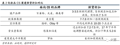 图7:国产品牌和海外大牌化妆品CS渠道供货折扣对比