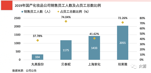 图16:2019年国产化妆品公司销售员工人数及占员工总数比例