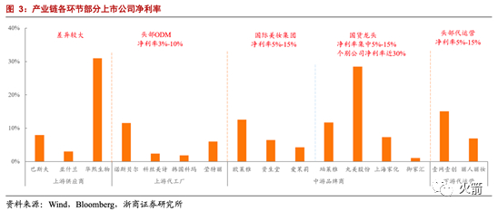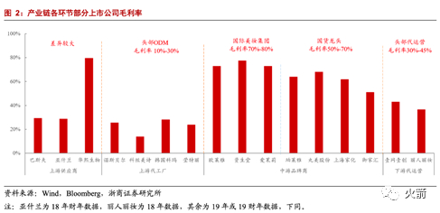 其中,身处中游的化妆品品牌商的毛利水平最高(图3)。欧莱雅(OREP.PA)等国际大牌的毛利率在70%-80%,珀莱雅等国产品牌的毛利率也有50%-70%。