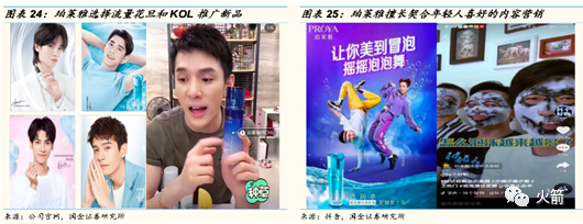 我们收集了今年7月三家品牌在小红书、抖音、微信、微博等社媒的相关数据,发现珀莱雅获得的用户点赞、收藏、评论、阅读次数远远高于上海家化和丸美(图17)。这实际上得益于珀莱雅完善的营销渠道和差异化的营销策略(图18)。珀莱雅更了解年轻人的想法,善于借助KOL口碑营销来推广新品,用年轻人喜闻乐见的内容打造爆品(图19)。