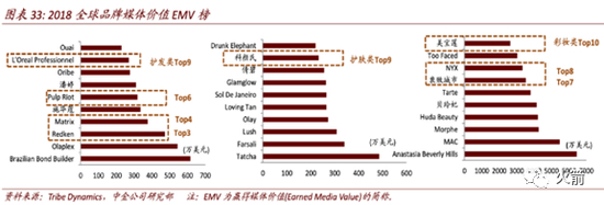 随着品牌知名度提升,消费者对于化妆品公司制造出的“希望”也更加认可。我们用“所赢得的媒体价值”(Earned Media Value,EMV)这一量化指标来衡量品牌营销口碑,可以看到欧莱雅等海外大牌的‘造梦’能力明显更强(图5)。