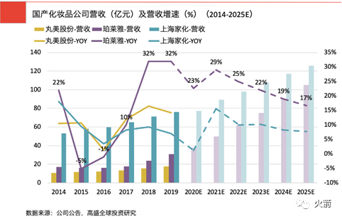 珀莱雅已经度过转型调整期,进入了快速增长期,2018-2019年营收同比增长30%以上。高盛预计珀莱雅2019-2025年的营收CAGR约为22%,是三家中增速最快的。