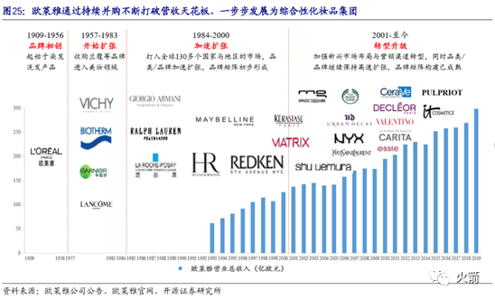 全球化妆品巨头基本都通过品牌多元化,实现了对绝大多数消费者的覆盖,驱动了营收增长。其中,欧莱雅通过持续并购其他品牌,打破了营收天花板(图41)。