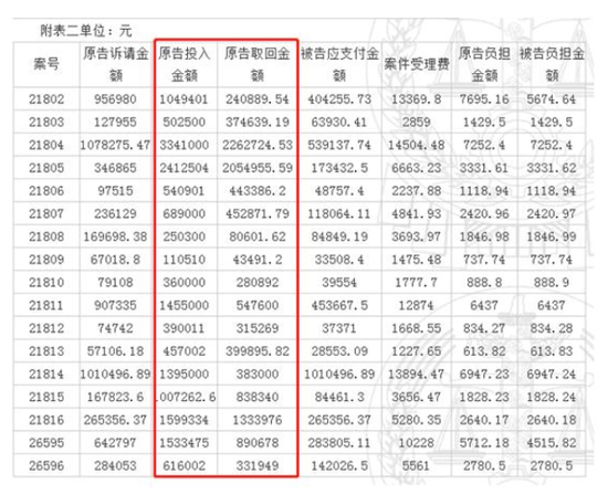 红星资本局统计发现,这一案件的17名原告,投入的金额在11.05万元到334.1万元不等,而他们的损失在5.7万元到107.8万元之间。