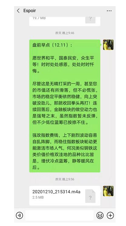 同时,严为民向红星资本局展示:12月10晚,他就将第二天(12.11)的盘前早点内容从微信上发给了另一个人。