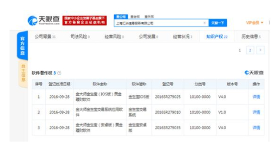 据天眼查APP,“金生宝安卓版”“金生宝IOS版”“金生宝交易系统”等软件著作权却是登记在汇焱信息——即小王所属的公司头上。甚至,汇焱信息的公司曾用名中都带有“金生宝”的字样。