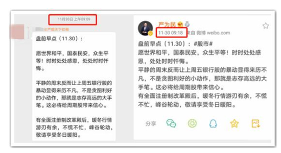 当天9点09分,小王发布了“盘前早点”信息到微信群。9分钟后,严为民的微博也发出了一模一样、一字不差的“盘前早点”信息。从这一天的发布时间先后来看,又似乎是严为民微博从小王微信群中搬运过去的。