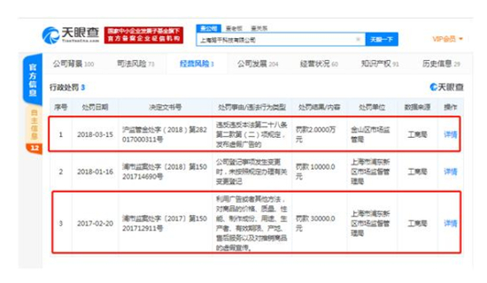 第二次是在2018年3月,由于路千科技违反相关规定发布虚假广告,被上海金山区市场监管局罚款2万元。