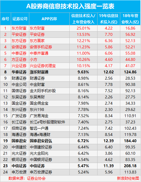 值得一提的是,尽管国泰君安(国泰君安君弘APP)、华泰证券(涨乐财富通APP)、中信证券(中信证券)信息技术投入的金额最高,分别为12.39亿元、12.02亿元、11.39亿元,但是,其投入强度并不高,分别只有6.72%、9.63%、5.47%,不足10%,在行业中的排名分别为第19名、第8名、第23名。