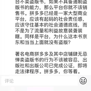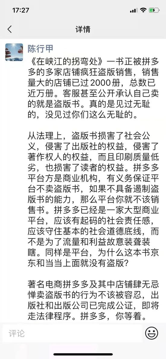 此前,已有媒体通过认真的核实证明在拼多多上盗版书猖獗的情况。近日,网红县委书记、2015年被评为全国优秀县委书记的陈行甲在微信朋友圈控诉他的新书《在峡江的拐弯处》遭到到拼多多疯狂盗版,还对拼多多说“你等着”。