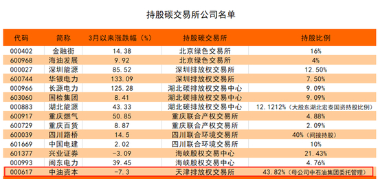另外,闽东电力(000993)参股4.76%股权的海峡股权交易中心(福建)有限公司,是福建省指定的碳排放权交易机构,提供碳排放权交易服务,交易品种包括福建省碳配额、国家核证自愿减排量(CCER)、福建省林业碳汇。海峡股权交易中心(福建)有限公司,以及重庆燃气(600917)参股4.88%股权的重庆联合产权交易所集团股份有限公司,也都是国家确定的9个碳排放权交易试点区域市场。自3月份以来,闽东电力(000993)的累计最高涨幅达65%,重庆燃气(600917)的累计涨幅也超过了50%。