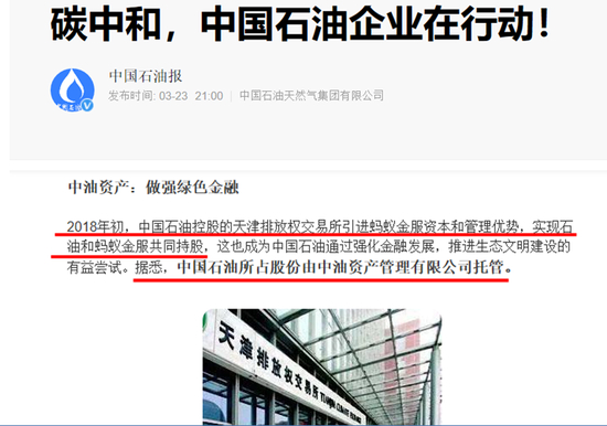 根据3月23日中国石油报题为《碳中和,中国石油企业在行动!》的报道,2018年初,中国石油集团控股的天津排放权交易所引进蚂蚁金服资本和管理优势,实现中国石油集团和蚂蚁金服共同持股,这也成为中国石油集团通过强化金融发展,推进生态文明建设的有益尝试。