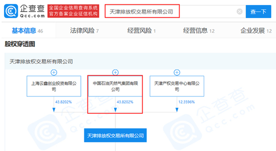 根据企查查显示,目前中国石油集团和蚂蚁金服全资子公司上海云鑫创业投资有限公司分别持有天津排放权交易所43.82%股权,天津产权交易中心有限公司持有天津排放权交易所12.36%股权。