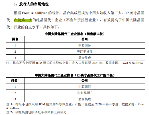 在申报稿中,晶合集成说,公司已成为收入第三大、12 英寸晶圆代工产能第三大的中国大陆纯晶圆代工企业(不含外资控股企业),前面两家是中芯国际和华虹半导体。