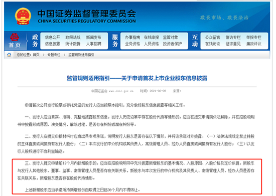 证监会及沪深交易所2月5日发布公告显示, 申报前12个月内产生的新股东将被认定为突击入股,且上述新增股东应当承诺所持新增股份自取得之日起36个月内不得转让。