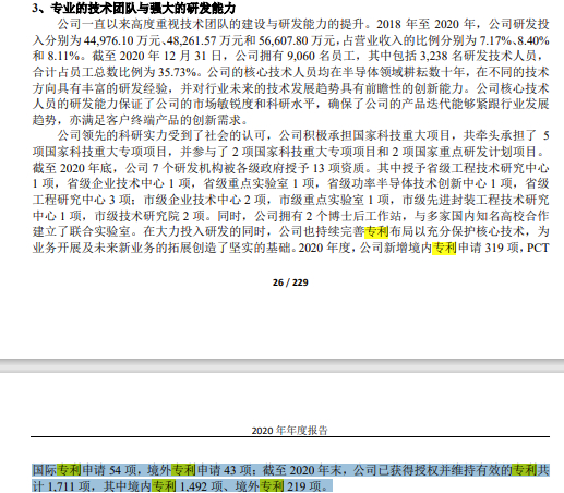 2020 年度,华润微新增境内专利申请 319 项,PCT国际专利申请 54 项,境外专利申请 43 项;截至 2020 年末,公司已获得授权并维持有效的专利共计 1711 项,其中境内专利 1492 项、境外专利 219 项。