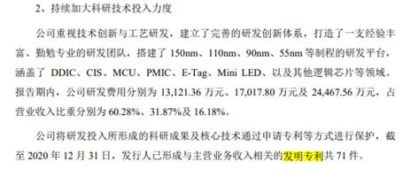 可以看出,中芯国际、华虹半导体、华润微拥有的专利均超过了1000项。而截至2020 年 12 月 31 日,晶合集成已形成与主营业务收入相关的发明专利仅仅共71件。