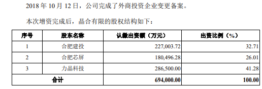 正式量产一年后,2018 年 10 月,晶合有限增资,合肥芯屏、力晶科技入股,正式开启“三分天下”的时代。具体来看,合肥建投持股32.71%,合肥芯屏持股26.01%,力晶科技持股41.28%。