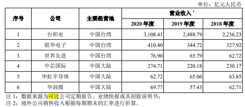 而晶合集成就是专注于集成电路的制造环节。在申报稿中,晶合集成表示,同行业可比公司有台积电、联华电子、世界先进、中芯国际、华虹半导体、华润微。