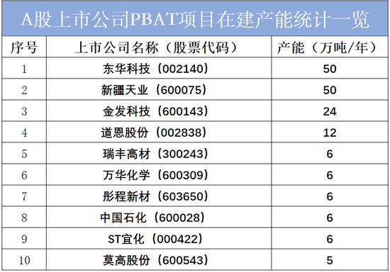 那么,东华科技(002140)投资建设的50万吨/年PBAT项目,这个产能在国内A股上市公司同行中,究竟处于怎样一个地位呢?我们可以简单来梳理一下国内A股上市公司投资PBAT项目的相关产能情况: