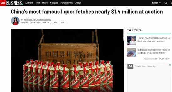 据CNN报道,近日,英国伦敦苏富比拍卖行宣布,一箱1974年的“葵花牌”茅台以100万英镑(约900万元人民币)的价格售出,是此前预估售价的五倍多。